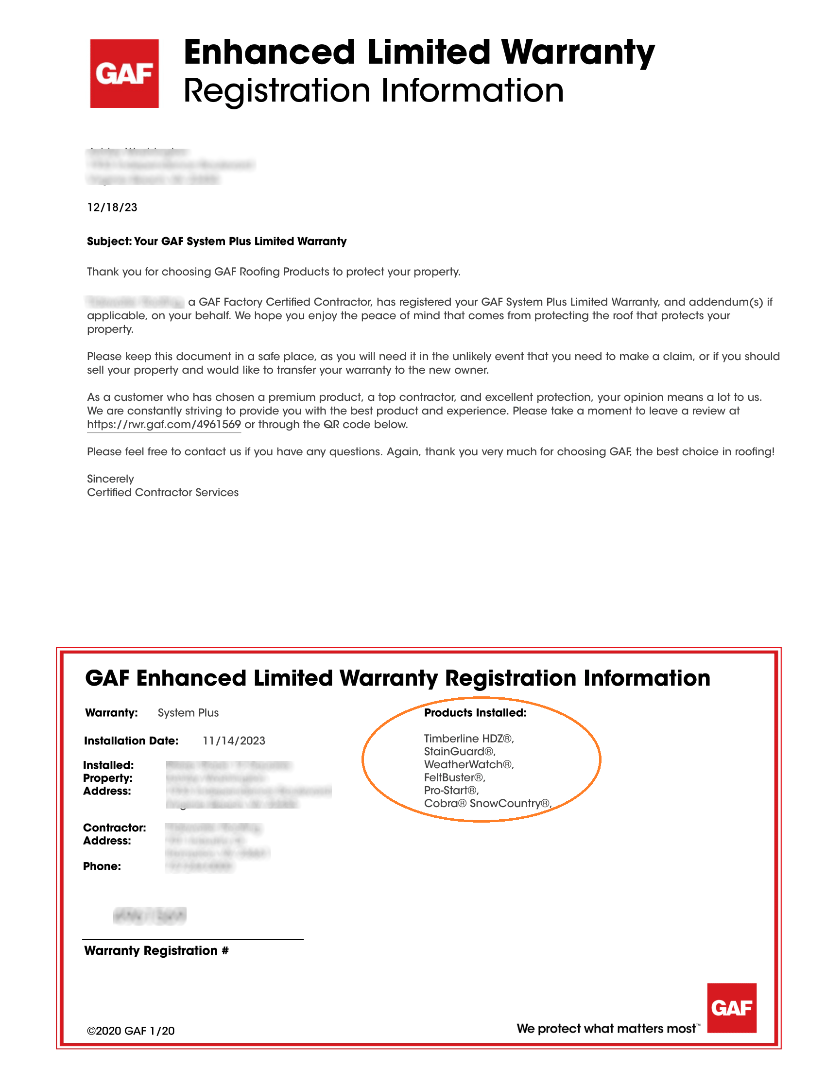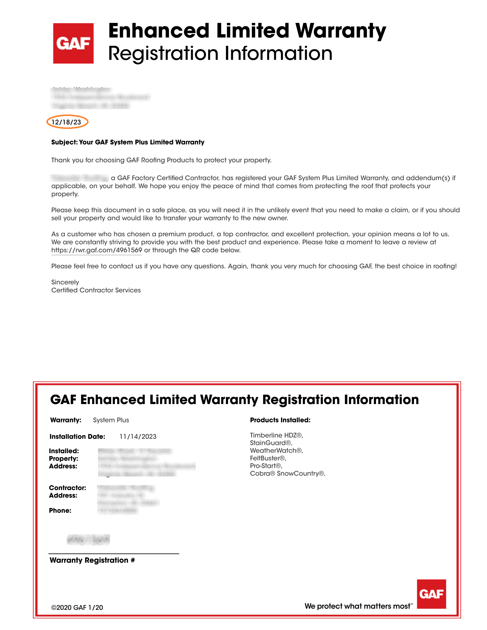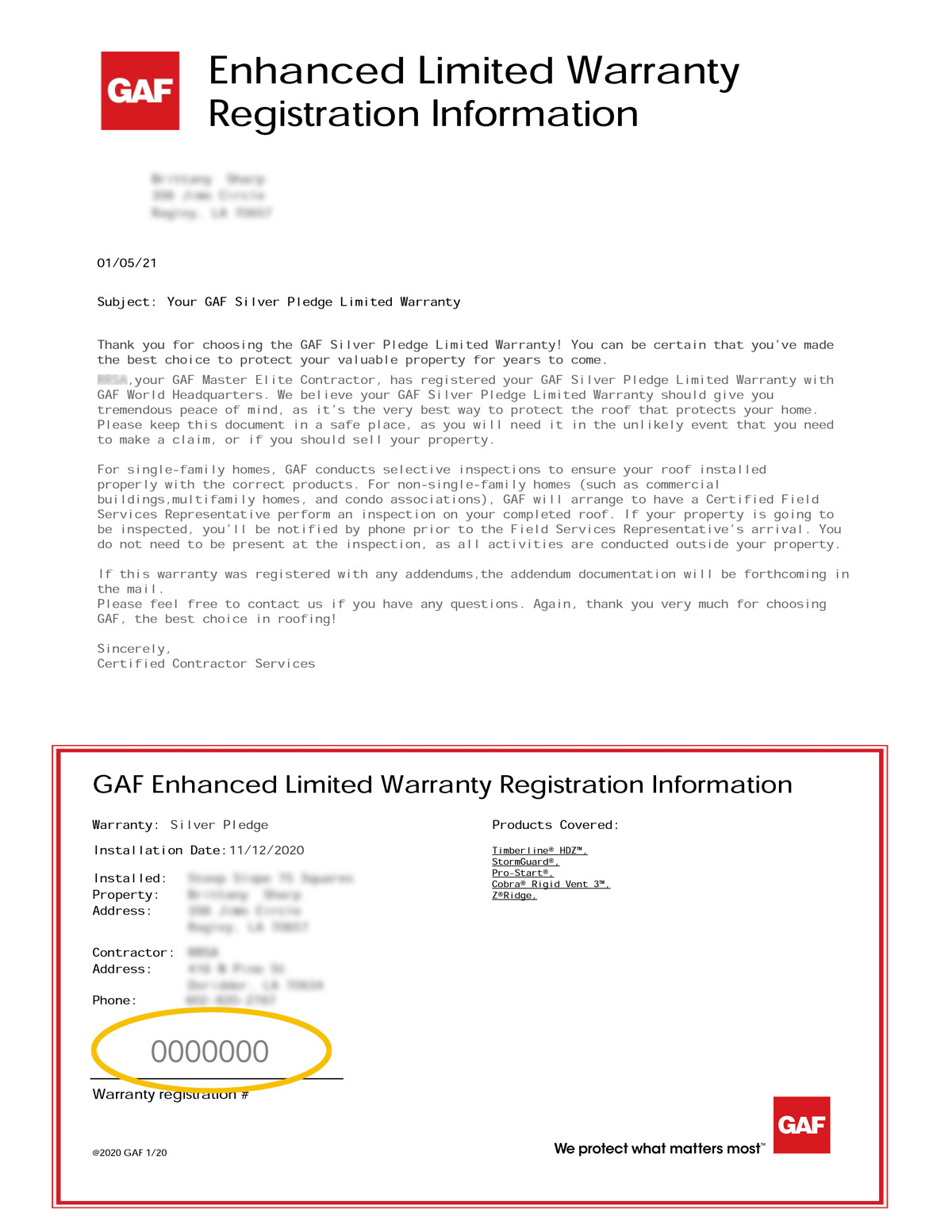 3 Eligibility requirements, coverage and restrictions vary based on the enhanced warranty selected. Visit www.gafroofsfortroops.com for details and to view a copy of each enhanced warranty. Enhanced warranty must be registered by your contractor within forty-five (45) days of installation. If you have not received a copy of your warranty from GAF within sixty (60) days, call GAF at 1-888-532-5767, option 5.