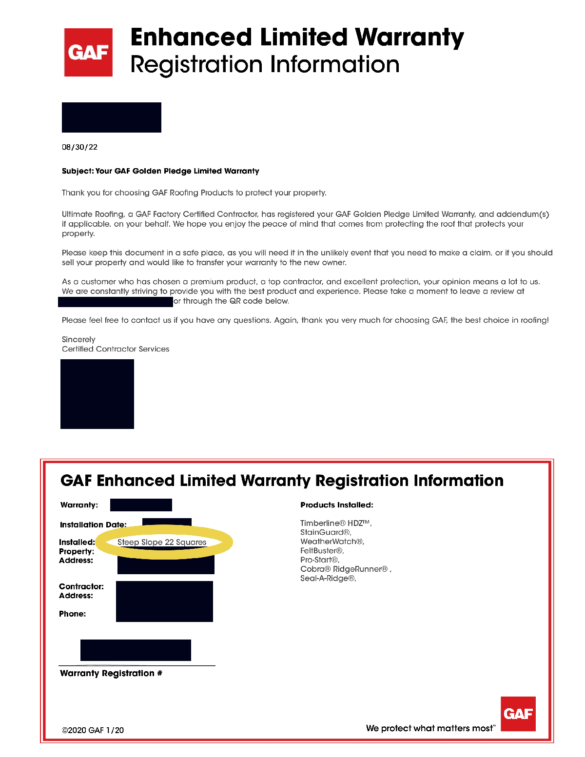 3 Eligibility requirements, coverage and restrictions vary based on the enhanced warranty selected. Visit www.gafroofsfortroops.com for details and to view a copy of each enhanced warranty. Enhanced warranty must be registered by your contractor within forty-five (45) days of installation. If you have not received a copy of your warranty from GAF within sixty (60) days, call GAF at 1-888-532-5767, option 5.